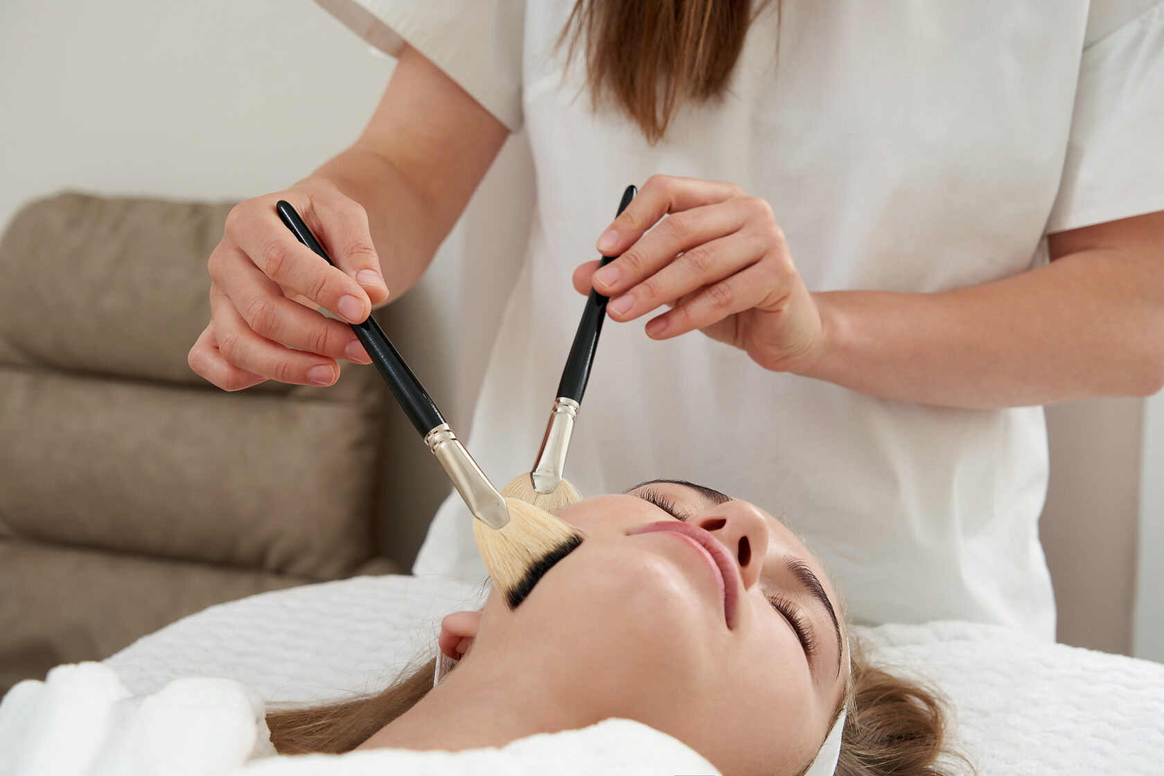 Как проходит пилинг? Сначала лицо очищают от макияжа, затем на кожу наносят кислоту. Через пару минут вы почувствуете жжение и покалывание, чтобы справиться с болезненными ощущениями врач будет обмахивать лицо веером. Некоторые специалисты рекомендуют за час до процедуры принять болеутоляющее средство. Первичная реакция кожи – это покраснение, оно наступает примерно через 5 – 10 минут. Для поверхностного пилинга этого достаточно, в данном случае кислота реагирует только с ороговевшими клетками кожного покрова. При срединном пилинге концентрация кислоты выше и вслед за покраснением кожи через несколько минут кожа покрывается белым налетом, похожим на иней. Это так называемый «фрост-эффект», который свидетельствует о том, что кислота вступила во взаимодействие с живыми клетками кожи. Сразу после пилинга заметен эффект лифтинга, небольшое покалывание может ощущаться в течение часа после процедуры.